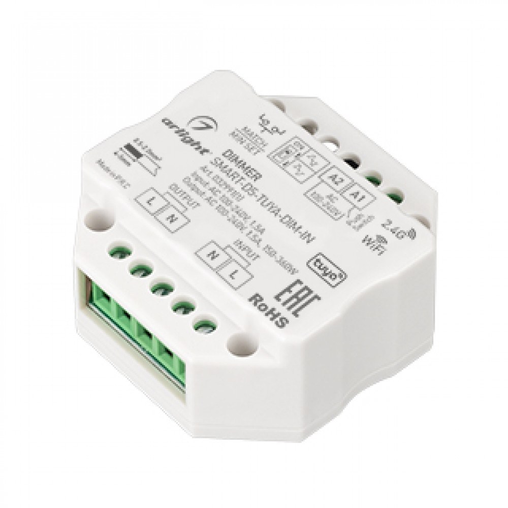 Диммер SMART-D5-TUYA-DIM-IN (230V, 1.5A, TRIAC, WiFi, 2.4G) 032991(1), TRIAC диммер, предназначенный для управления диммируемыми источниками света с напряжением питания 230В. Управляется пультами и панелями серии SMART. Поддерживает функцию Push-Dim. Интерфейс Tuya, интегрированный Wi-Fi. Поддерживается управление ЯНДЕКС АЛИ