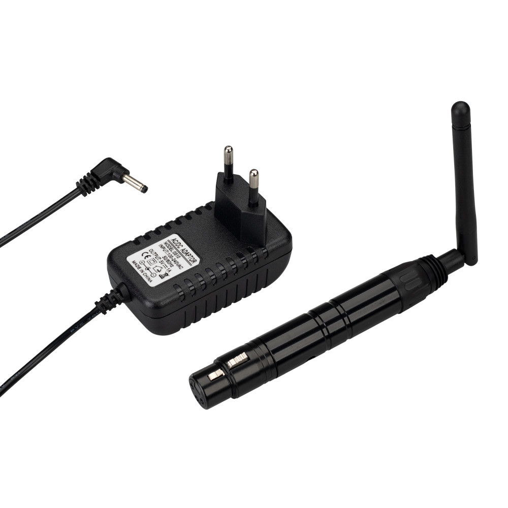 Беспроводной приёмник (усилитель) сигнала DMX512. Вход - радиосигнал 2.4G, выход DMX512. Разъем XLR3 Male, питание DC 5V (укомплектован адаптером). Максимальное расстояние между передатчиком и приёмником сигнала - 400 метров. Габариты 215x21x21 мм. Работа
