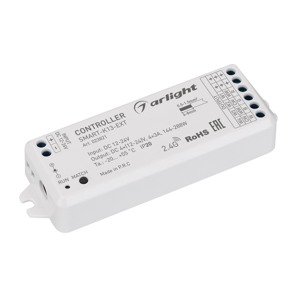 Контроллер SMART-K13-SYNC (12-24V, 4x3A, 2.4G) 023821, Миниатюрный универсальный 4-х канальный контроллер для светодиодной DIM/MIX/RGB/RGBW лент и модулей (ШИМ). Сихронизация с аналогичными контроллерами до 15 метров, общая длина системы до 100 метров. Питание/рабочее напряжение 12-24VDC, максимальный ток 3A