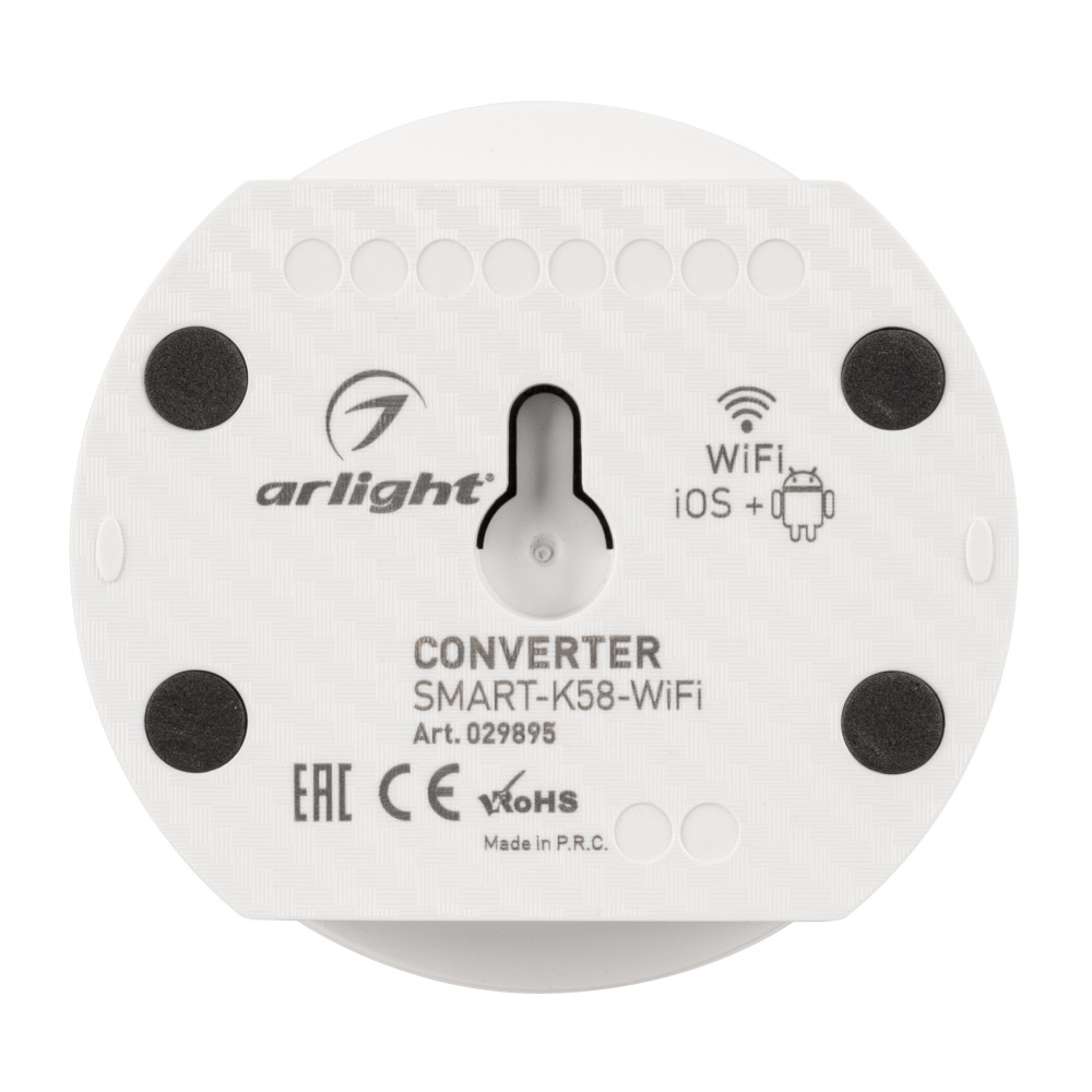 Конвертер SMART-K58-WiFi White (5-24V, 2.4G) 029895, Конвертер WIFi сигнала в RF. Питание/рабочее напряжение 5-24VDC, выходной сигнал 2.4G, входной сигнал WiFi со смартфона. Корпус - белый PVC. Габариты 72х25 мм. Мобильное приложение Smart Arlight для iOS доступно в App Store, приложение для Android доступн