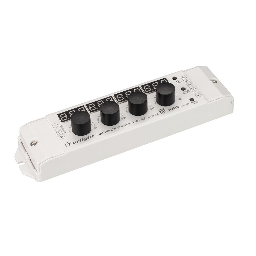 Контроллер SMART-K60-MIX-SUF (12-24V, 4x4A, 2.4G) 031614, Диммер для мультибелой (MIX) светодиодной ленты (ШИМ). Управление с помощью потенциометра, изменяемая частота ШИМ (250Hz-8KHz), выбор типа диммирования (линейное либо логарифмическое). Питание/рабочее напряжение 12-24VDC, максимальный ток 4A на канал, 2 п