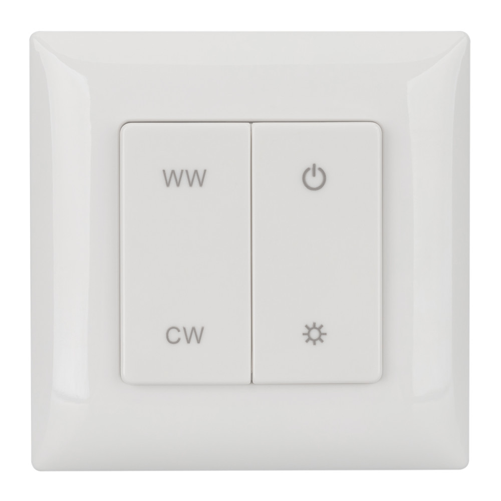 Накладная кнопочная панель 2.4 ГГц, цвет белый. Материал - пластик. Для управления мультибелыми (MIX) источниками света (ШИМ), 1 зона управления. Питание/рабочее напряжение 3VDC от батарейки CR2032. Габариты 86х86х14 мм. Совместима с контроллерами SMART.