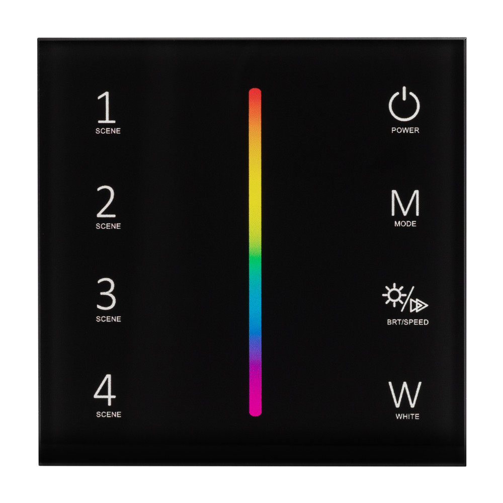 Встраиваемая сенсорная стеклянная панель 2.4 ГГц, цвет чёрный. Для управления светодиодными RGBW источниками света (ШИМ). Управление цветом с помощью сенсорной полосы. Работает в режиме master/slave и может выполнять функцию независимого контроллера. Пита