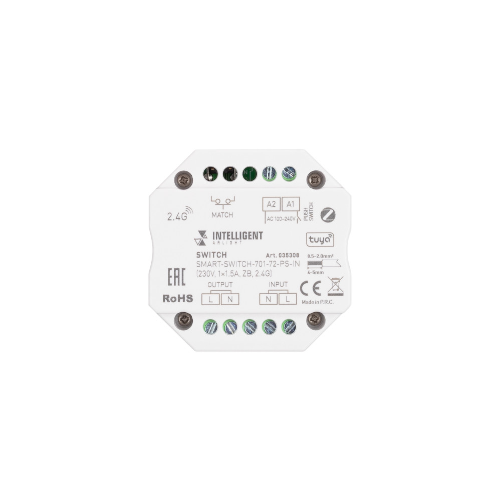 INTELLIGENT ARLIGHT Релейный модуль SMART-SWITCH-701-72-PS-IN (230V, 1x1.5A, ZB, 2.4G) 035308, Выключатель для любых видов нагрузки AC 230V. Напряжение питания AC 100-240V, максимальный ток нагрузки 1.5А. Управление 2.4G+WiFi, интерфейс Tuya (через Tuya ZigBee шлюз), поддерживается управление ЯНДЕКС АЛИСА, совместим с приложением INTELLIGENT ARLIGH