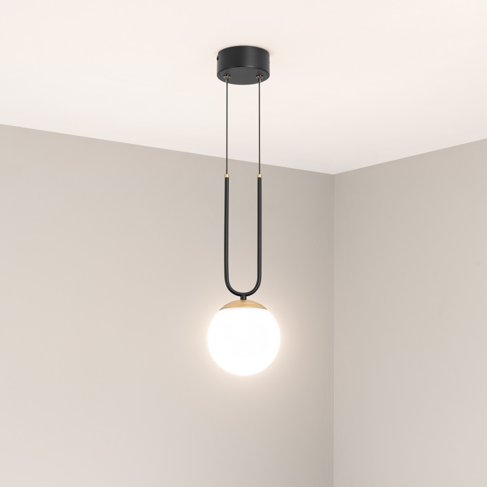 Светильник SP-BEADS-HANG-U-R130-10W Day4000 (BK-GD, 275 deg, 230V) 036526, Подвесной светильник. Мощность 10 Вт, св. поток 710 лм, 71 лм/Вт, дневной 4000 K, CRI>90, угол 275°, напряжение питания 230 В. Черно-золотой круглый корпус из алюминия и стали, рассеиватель стекло, степень защиты IP20. Размер: диаметр 130 мм, высота ножки
