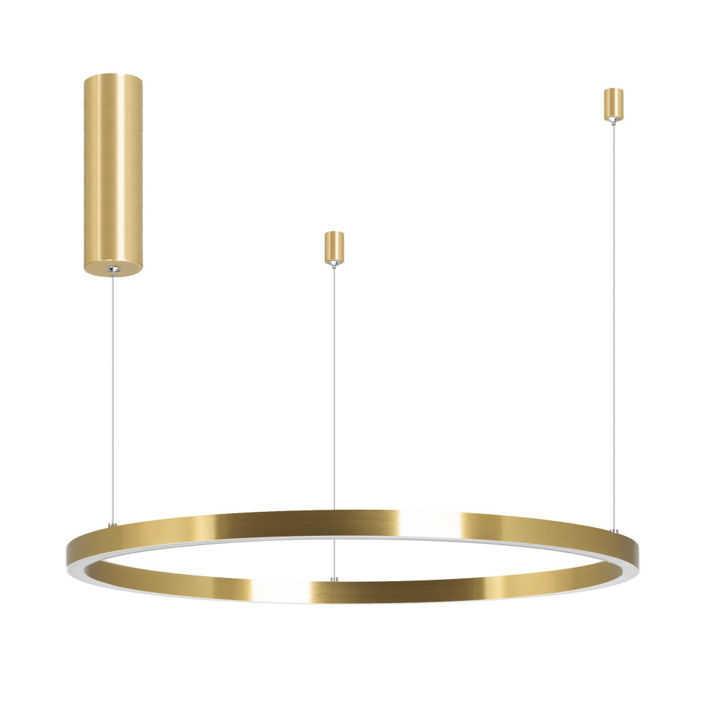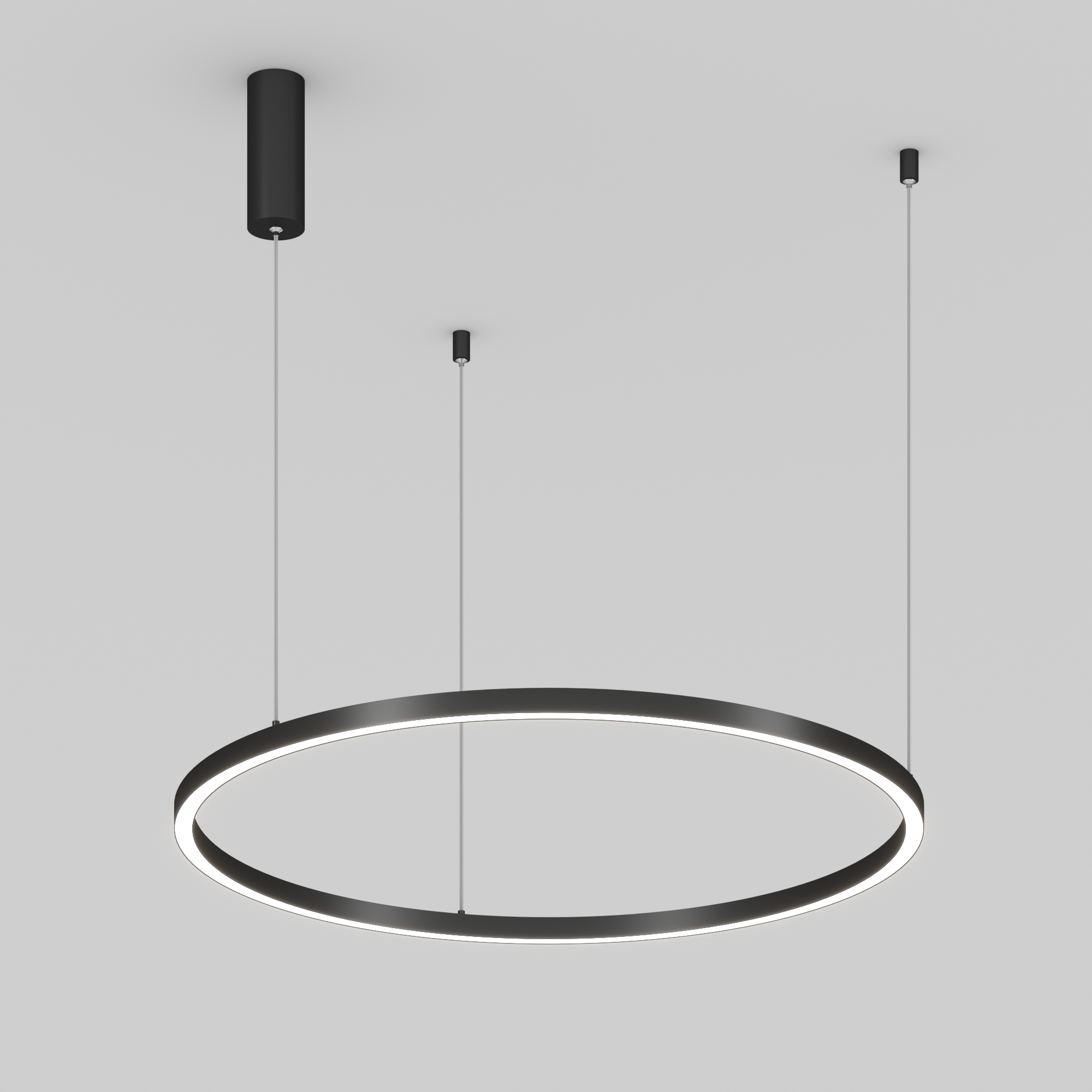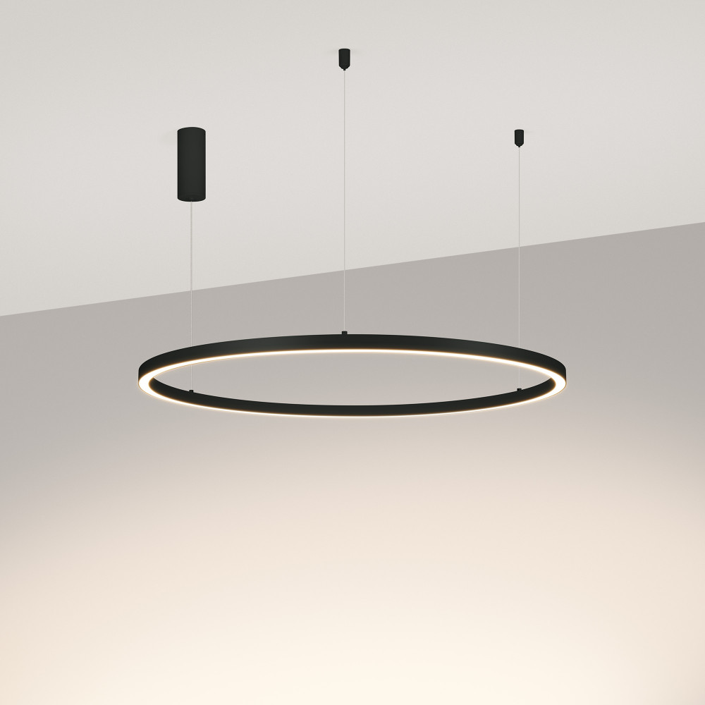 Подвесной светильник. Мощность 42 Вт, св. поток 2500 лм, 60 лм/Вт, дневной 4000 K, CRI>90, угол 120°, напряжение питания 230 В. Черный круглый корпус из алюминия, экран силикон, степень защиты IP20. Размер: диаметр 800 мм, высота 25 мм, ширина профиля 25