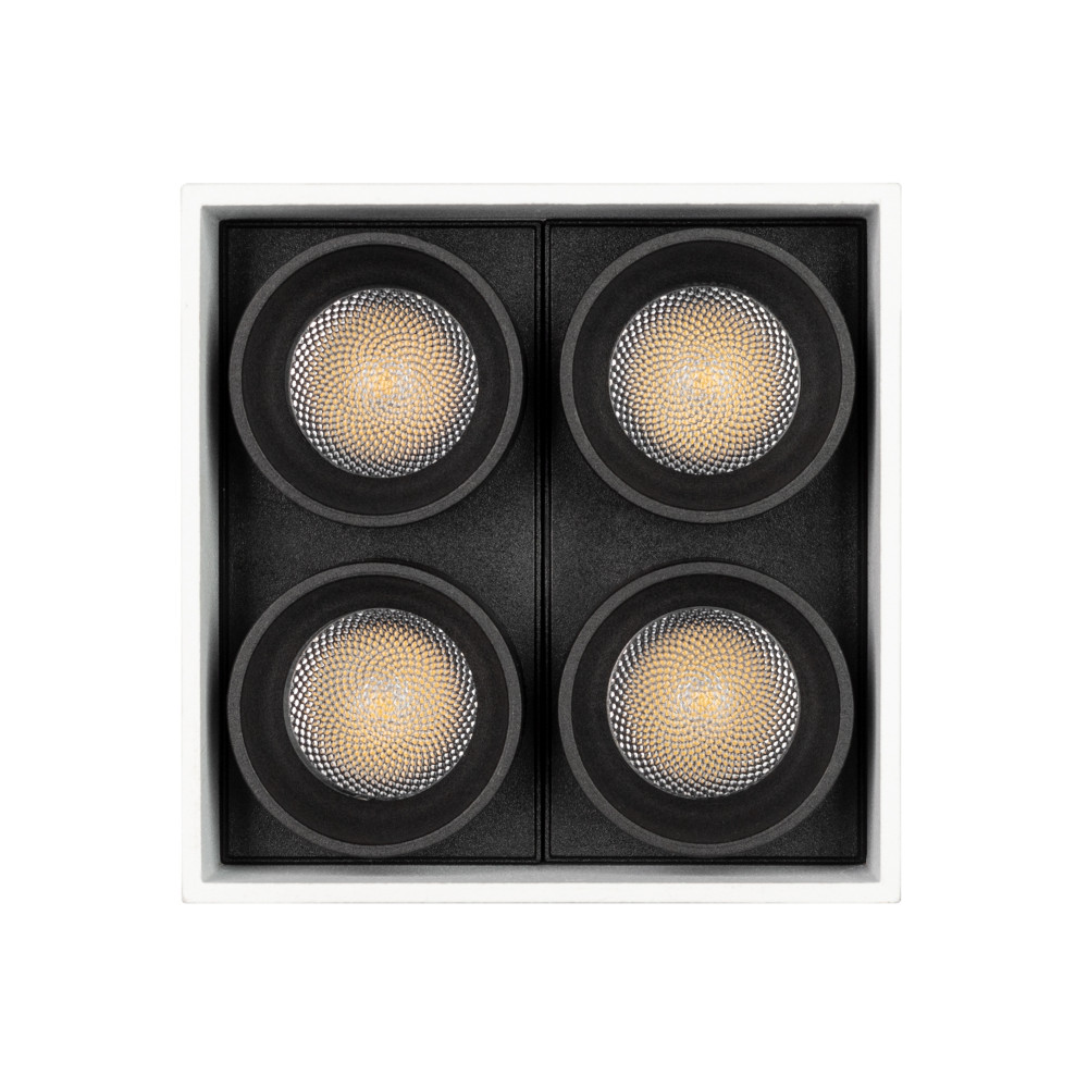 Накладной интерьерный светильник. Мощность 10 Вт, св. поток 634 лм, 64 лм/Вт, дневной 4000 K, CRI>98, угол 30°, напряжение питания 230 В. Белый квадратный корпус из алюминия, степень защиты IP20. Размер: длина 65 мм, ширина 65 мм, высота 85 мм. Монтаж нак