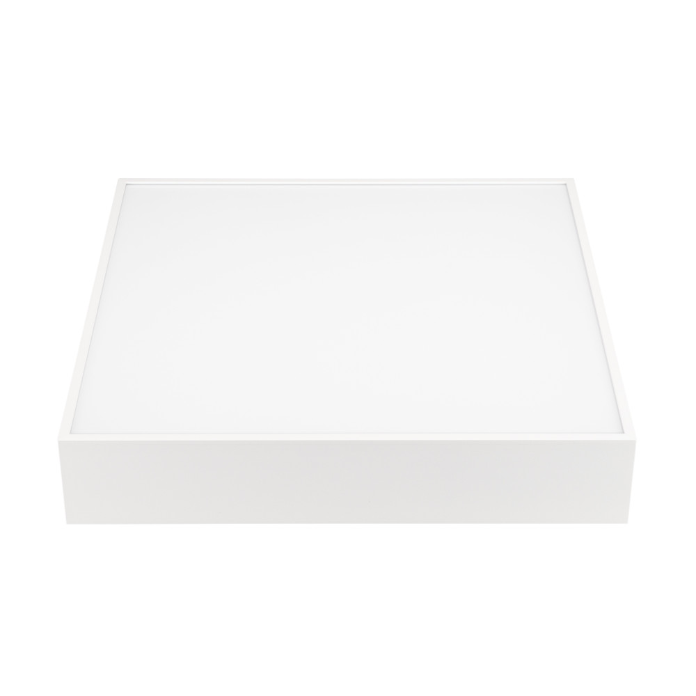 Накладной светильник. Мощность 30 Вт, св. поток 2000-2540 лм, 85 лм/Вт, дневной 4000 K, CRI>90, угол 120°, напряжение питания 230 В. Белый квадратный корпус из алюминия, экран PC, степень защиты IP40. Размер: длина 350 мм, ширина 350 мм, высота 64 мм. Мон