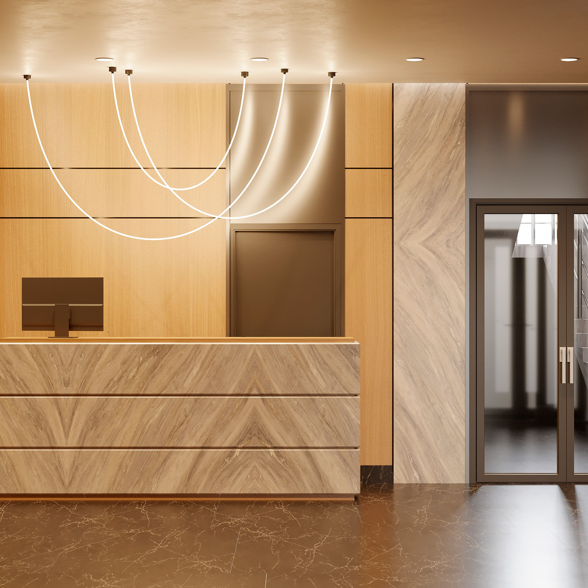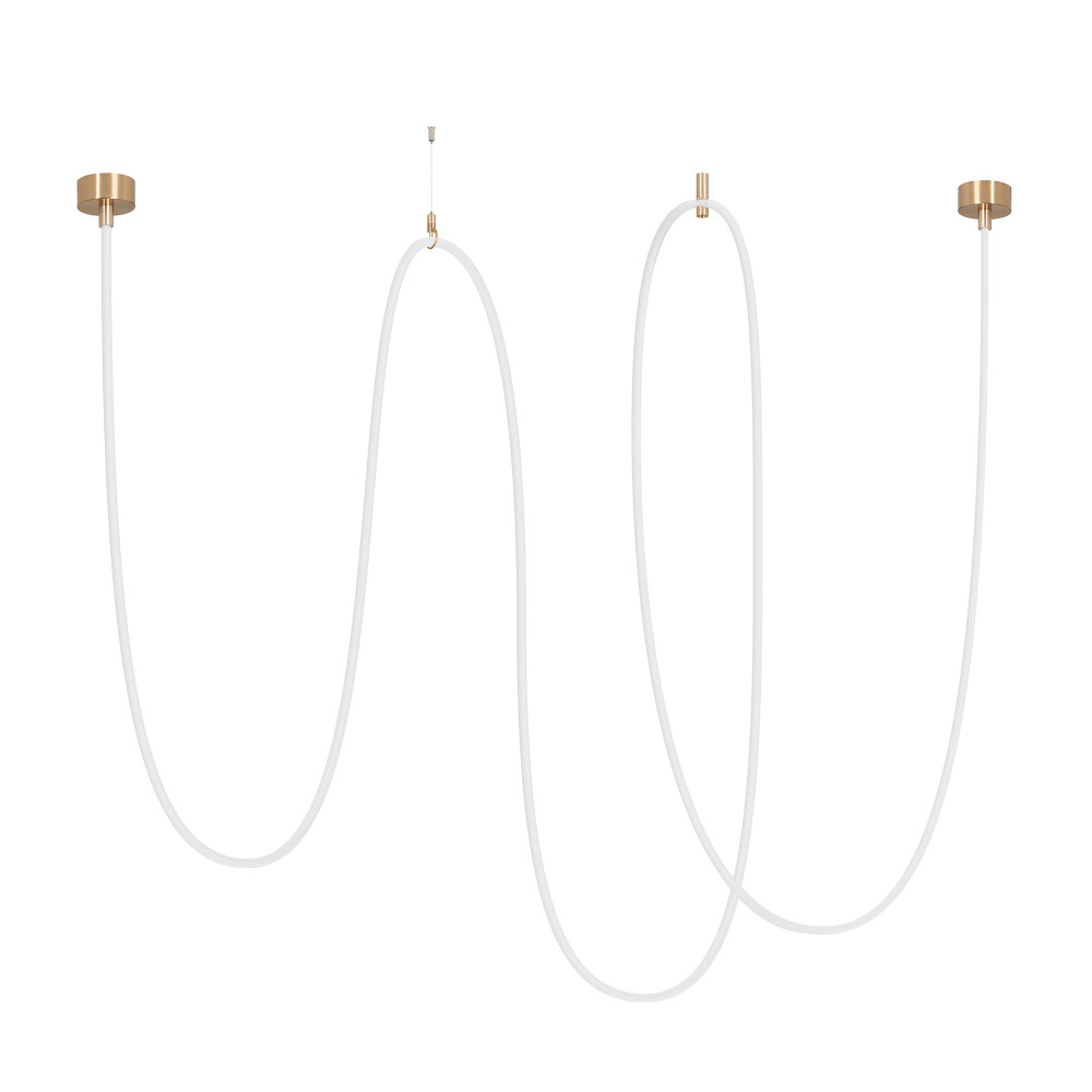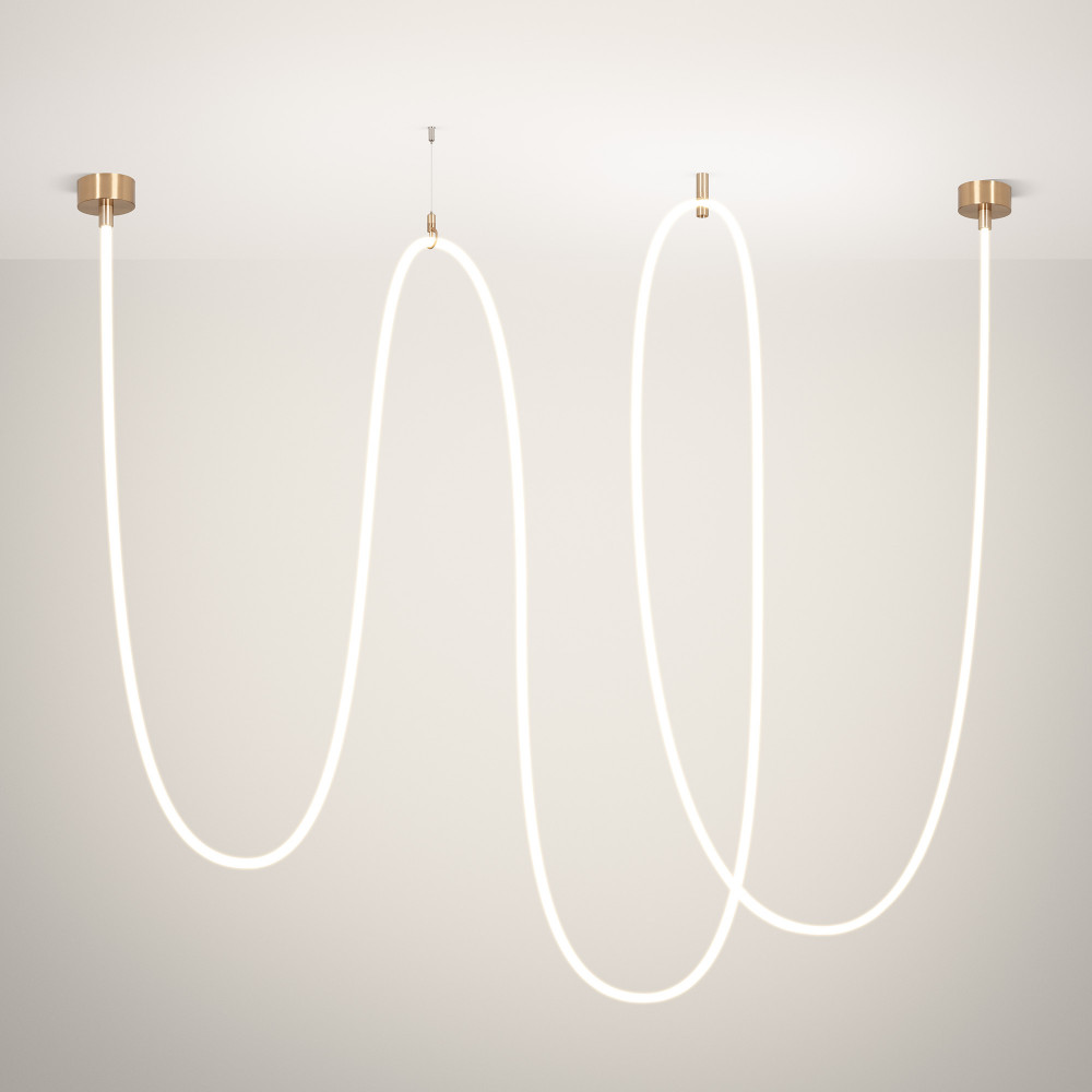 Подвесной светильник. Мощность 110 Вт, св. поток 7455 лм, 67 лм/Вт, дневной 4000 K, CRI>90, угол 360°, напряжение питания 230 В. Золотой круглый корпус из стали, силиконовая герметичная лента, степень защиты IP20. Размер: общая высота чаши 85 мм, высота ч
