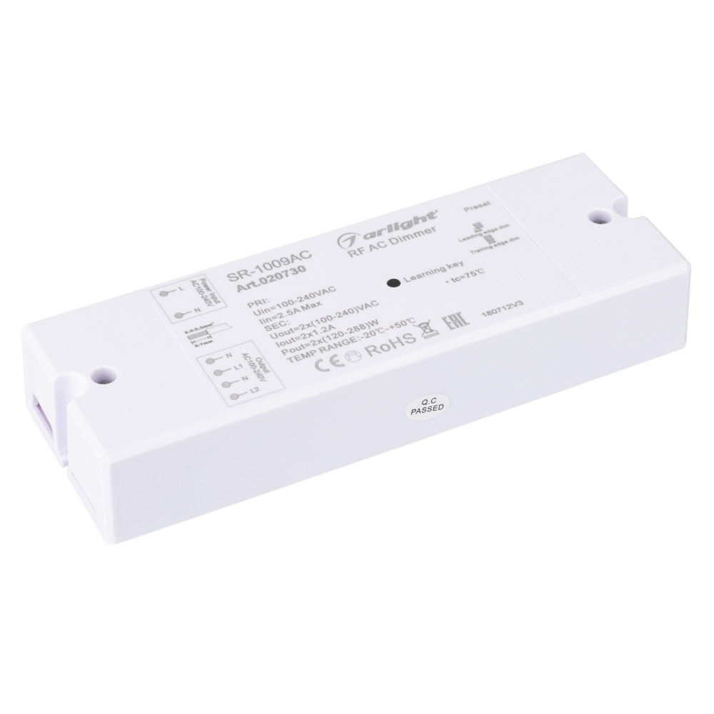 Диммер SR-1009AC (230V, 2x1.2A) 020730, Диммер с RF управлением (пульт поставляется отдельно) и выходом TRIAC/MOSFET с возможностью переключения фронтов LEADING/TRAILING. Мощность активной нагрузки (лампы накаливания) макс. 2х288 Вт. Полная мощность для электронной нагрузки (диммеры) макс. 2х72