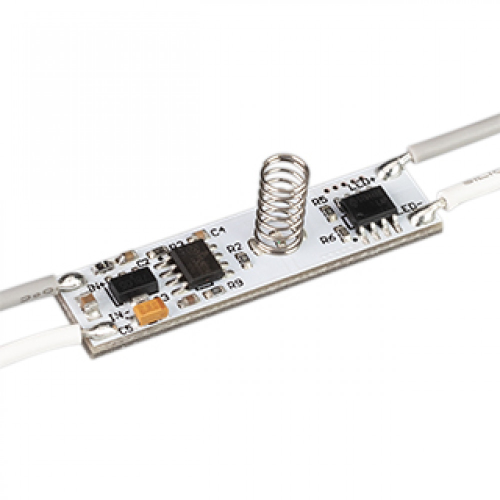 Микродиммер SR-IRIS-SN-DIM (12-24V, 1x5A, 38x10mm) 029108(2), Сенсорный диммер с подсветкой (есть возможность регулировки яркости и отключение подсветки зоны сенсора), встраиваемый в профиль. Реагирует на прикосновение к экрану. Короткое нажатие - плавное включение и выключение света. Длинное нажатие - плавное измен