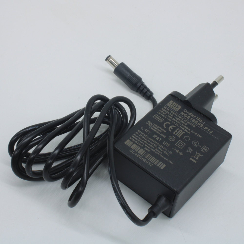 NGE18E09-P1J, AC-DC, 18Вт, сетевой адаптер, выход 9В/2А, вход 80...264В AC, 47...63 Гц, изоляция 4000B DC, 2xMOPP, 48x28*x55мм, -30...+70C, евровилка, выходной разъем 11мм, диам. 5.5х2.1мм