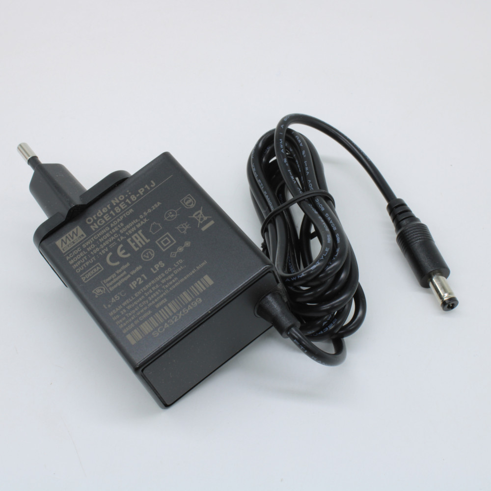 NGE18E18-P1J, AC-DC, 18Вт, сетевой адаптер, выход 18В/1А, вход 80...264В AC, 47...63 Гц, изоляция 4000B DC, 2xMOPP, 48x28*x55мм, -30...+70C, евровилка, выходной разъем 11мм, диам. 5.5х2.1мм