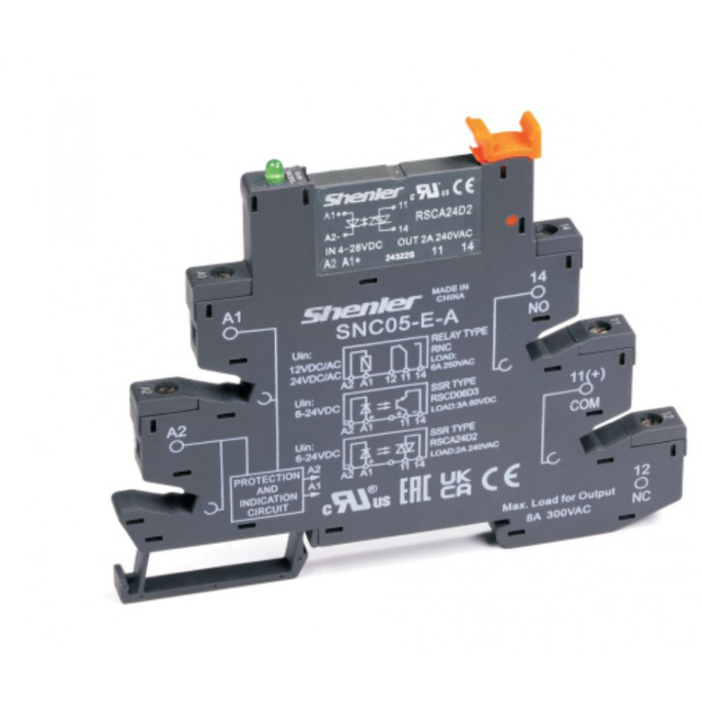 Реле с колодкой RSCA24D2+SNC05-E-A, Реле интерфейсное полупроводниковое RSCA24D2 с колодкой SNC05-E-A, винтовая фиксация провода, 1CO, 2A(280VAC), 12-24VDC, светодиод, ширина 6,2 мм