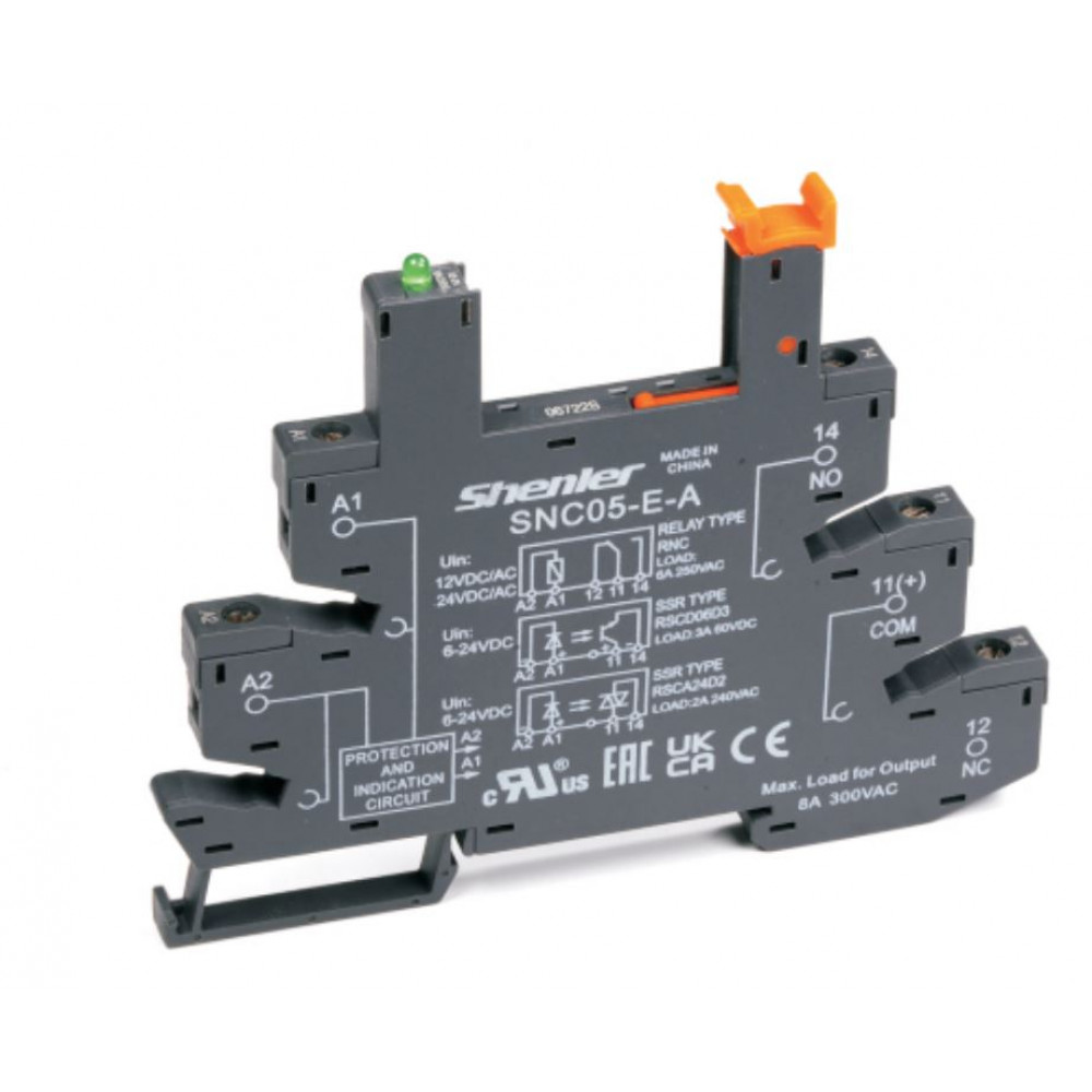 Колодка для реле SNC05-E-DL, Колодка для реле, 1 группа переключающих контактов, винтовая фиксация провода, монтаж на DIN рейку, вход 230V, напряжение катушки 60VDC, для реле серии RNC, с возможностью установки (поставляется отдельно): перемычки SN20B, марк. шильд. SN64P