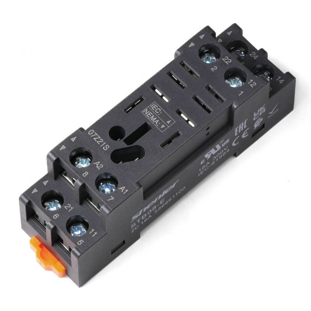 Колодка для реле STB08-E, Колодка для реле, 2 группы переключающих контактов, винтовая фиксация провода, монтаж на DIN рейку, 300V, 16A, для реле серий: RKL, с возможностью установки (поставляется отдельно): металл. фикс. SK36M, модуль AMD