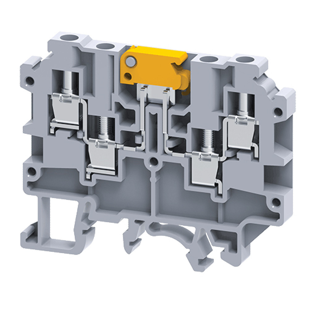 Клемма с ножевым размыкателем, 4 точки подключения, тип фиксации провода: винтовой, номинальное сечение: 4 мм кв., 28A, 800V, ширина: 6 мм, цвет: серый, тип монтажа: DIN35
