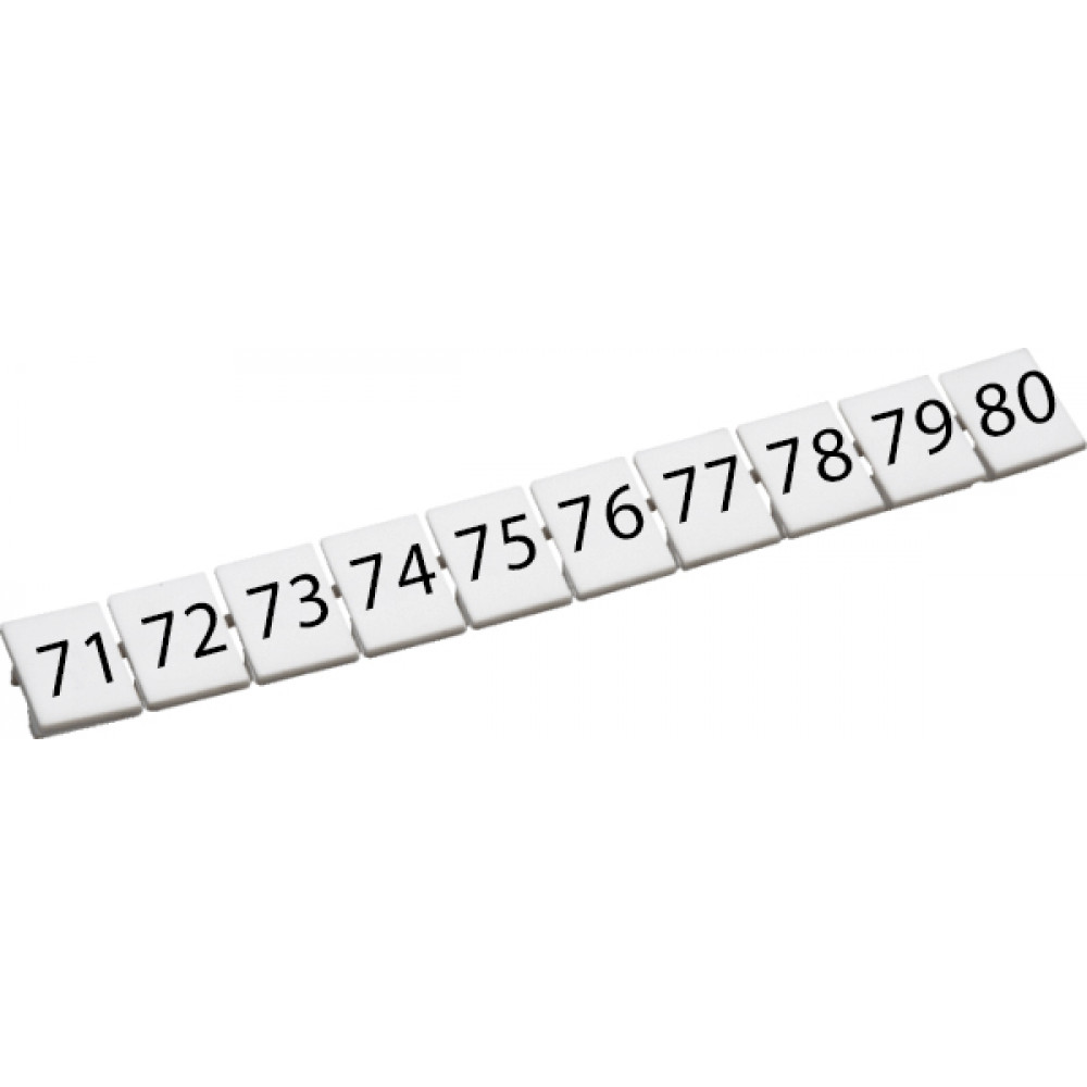 Маркировка для клемм шириной 5 мм, размер шильдика: 9,5*4,5 мм, 10 шильдиков, цвет: белый, нанесенные символы: 71-80 упаковка 100 шт.