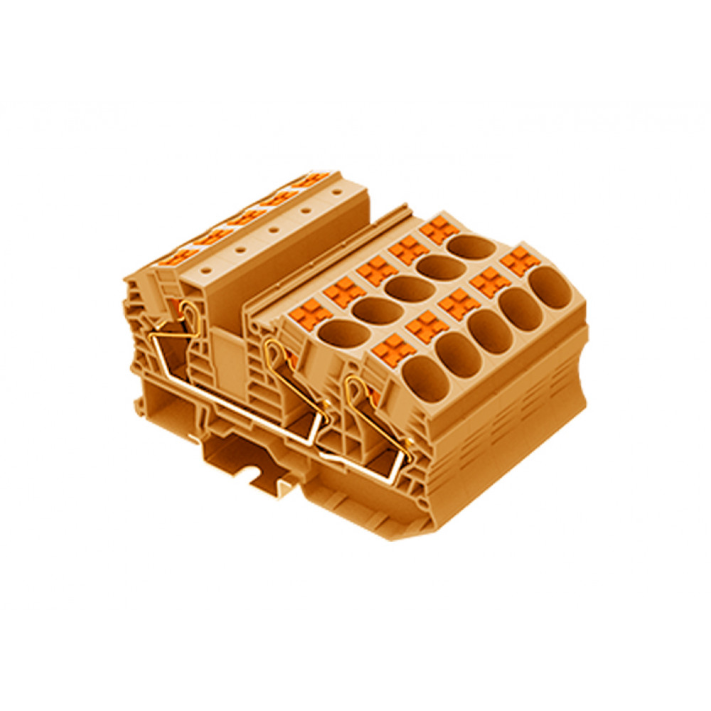 Проходная клемма, 3 точки подключения, тип фиксации провода: Push-in, номинальное сечение: 16 мм кв., 76A, 1000V, ширина: 12,2 мм, цвет: оранжевый, тип монтажа: DIN35