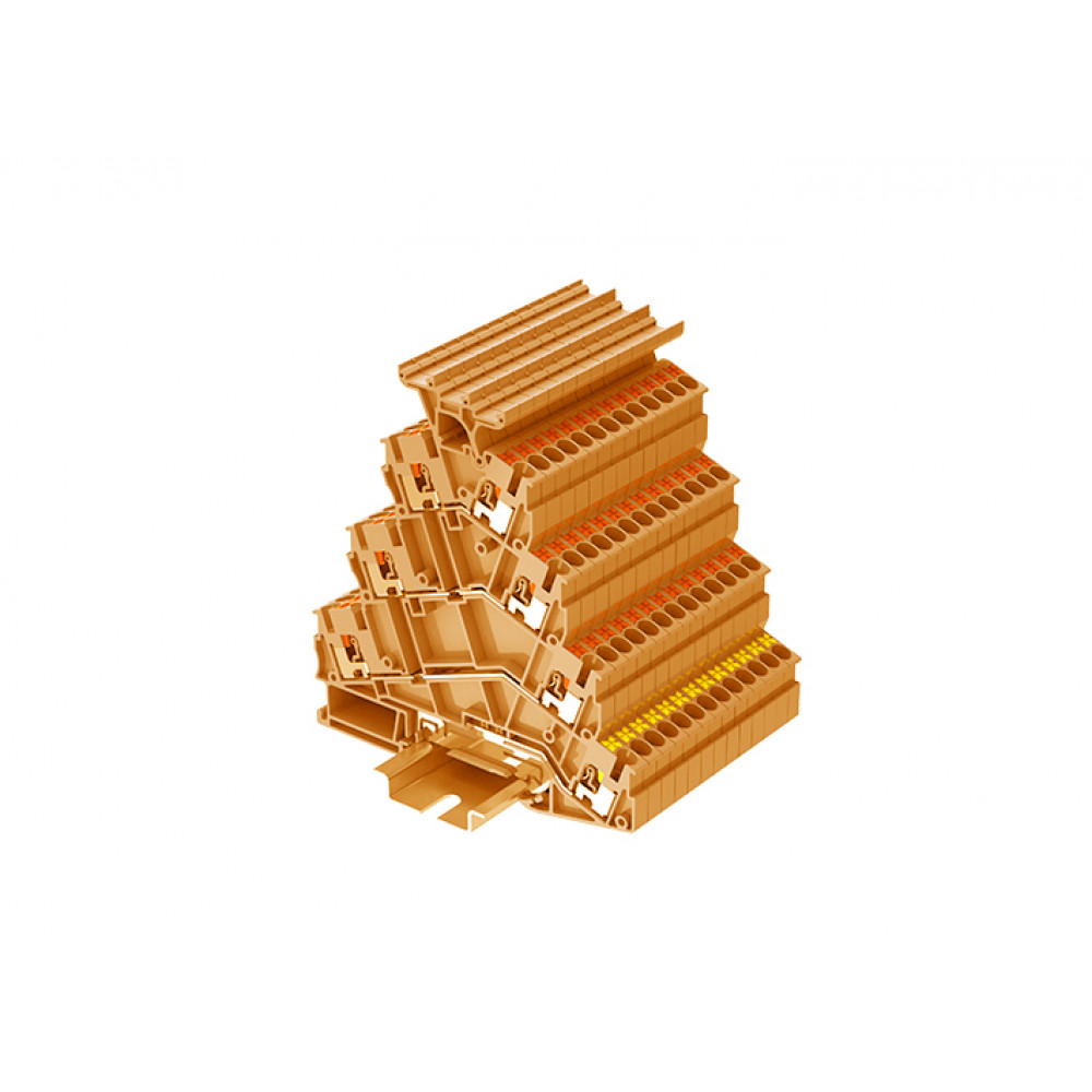 Этажная клемма, 3 этажа, L-L-L-PE, с держателем маркировки, нижний ряд с заземлением, тип фиксации провода: Push-in, номинальное сечение: 2,5 мм кв., 20A, 800V, ширина: 5,2 мм, цвет: оранжевый, тип монтажа: DIN35