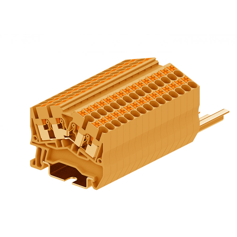Проходная клемма TPS2.5-4-OG, Проходная клемма, угловая, 4 точки подключения, тип фиксации провода: Push-in, номинальное сечение: 2,5 мм кв., 24A, 800V, ширина: 5,2 мм, цвет: оранжевый, тип монтажа: DIN35