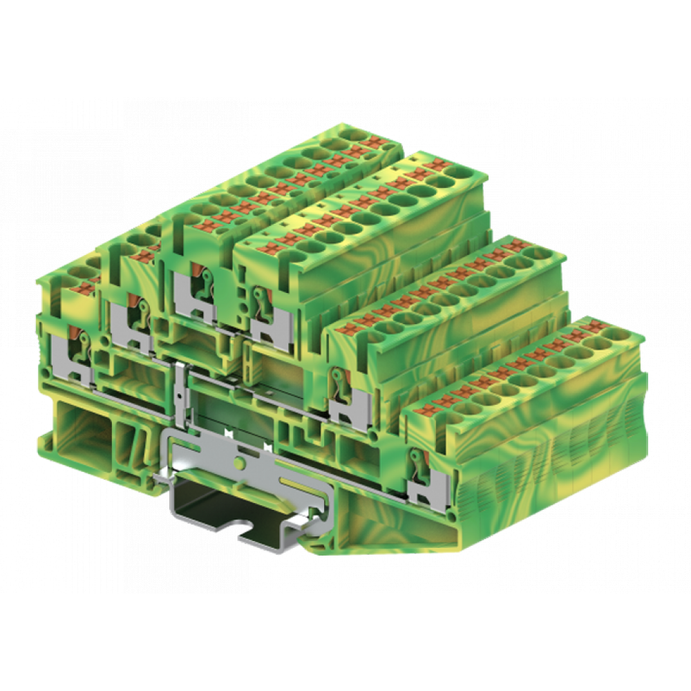 Заземляющая этажная клемма, 3 этажа, верхний ряд не заземлен, тип фиксации провода: Push-in, номинальное сечение: 2,5 мм кв., ширина: 5,2 мм, цвет: желто-зеленый, тип монтажа: DIN35