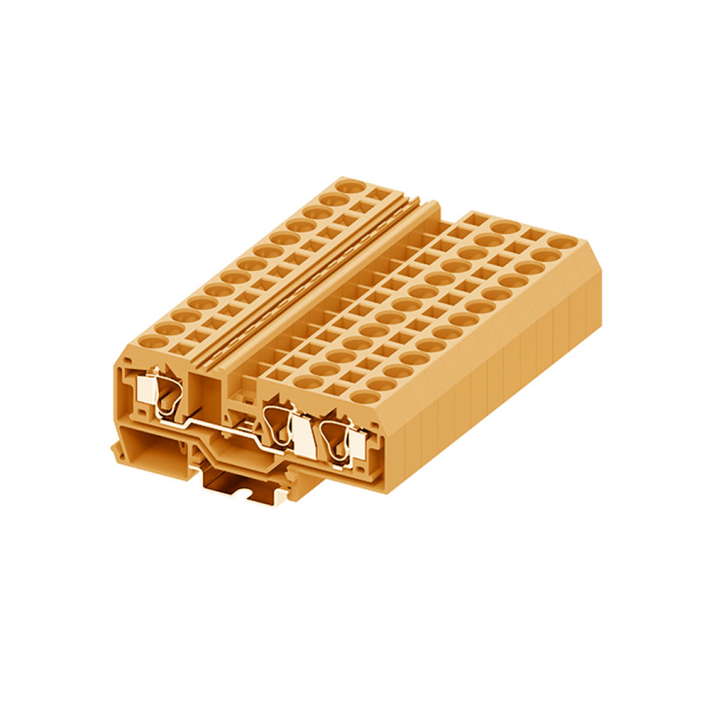 Проходная клемма, 3 точки подключения, тип фиксации провода: пружинный, номинальное сечение: 10 мм кв., 57A, 800V, ширина: 10 мм, цвет: оранжевый, тип монтажа: DIN35