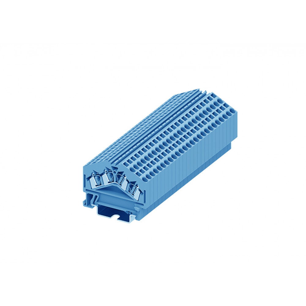 Проходная клемма, 4 точки подключения, тип фиксации провода: пружинный, номинальное сечение: 2,5 мм кв., 24А, 800V, ширина: 5 мм, цвет: синий, тип монтажа: DIN35
