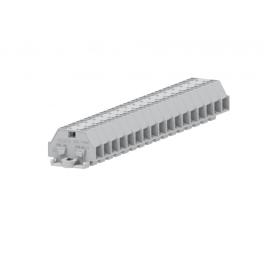 Проходная клемма (MINI) 240333, Проходная клемма, MINI, боковой подвод кабеля, 4 точки подключения, тип фиксации провода: пружинный, номинальное сечение: 1,5 мм кв., 18A, 400V, ширина: 8 мм, цвет: светло-серый, тип монтажа: монтажные фланцы