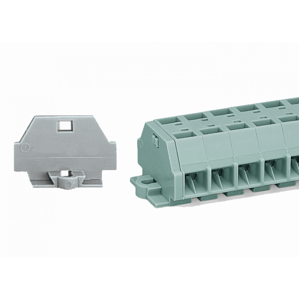 Клеммный блок 241216, Клеммный блок, боковой подвод кабеля, 16 клемм по 4 точки подключения, тип фиксации провода: пружинный, номинальное сечение: 2,5 мм кв., 24A, 500V, цвет: серый, тип монтажа: монтажные фланцы