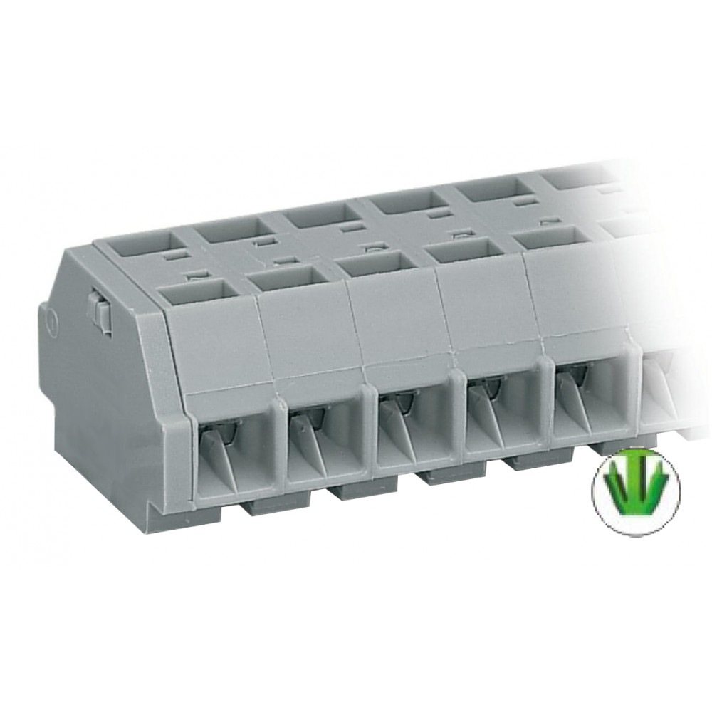 Клеммный блок, боковой подвод кабеля, 2 клеммы по 4 точки подключения, тип фиксации провода: пружинный, номинальное сечение: 2,5 мм кв., 24A, 500V, цвет: серый, тип монтажа: защелки в панель