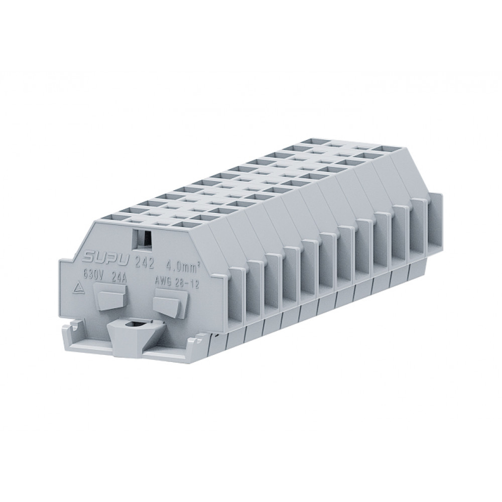 Проходная клемма (MINI) 242303, Проходная клемма, MINI, боковой подвод кабеля, 2 точки подключения, тип фиксации провода: пружинный, номинальное сечение: 4 мм кв., 24A, 630V, ширина: 7 мм, цвет: светло-серый, тип монтажа: монтажные фланцы