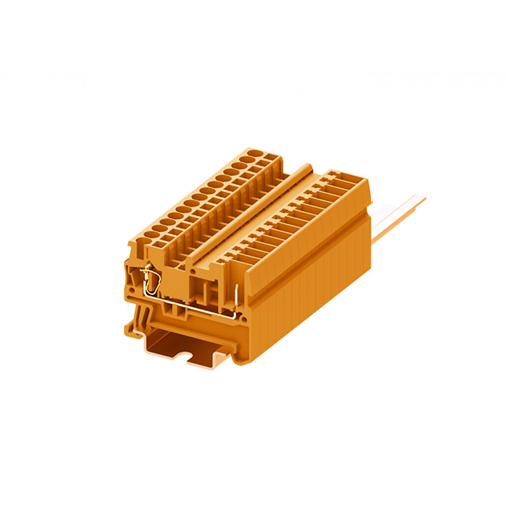 Клемма для подключения внешнего разъема, тип фиксации провода: пружинный, номинальное сечение: 2,5 мм кв., 24A, 500V, ширина: 5,2 мм, цвет: оранжевый, тип монтажа: DIN35