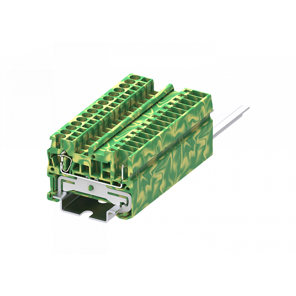 Заземляющая этажная клемма, 2 этажа, для подключения разъема, тип фиксации провода: пружинный, номинальное сечение: 2,5 мм кв., ширина: 5 мм, цвет: желто-зеленый, тип монтажа: DIN35, стандарт GB/T14048.1,