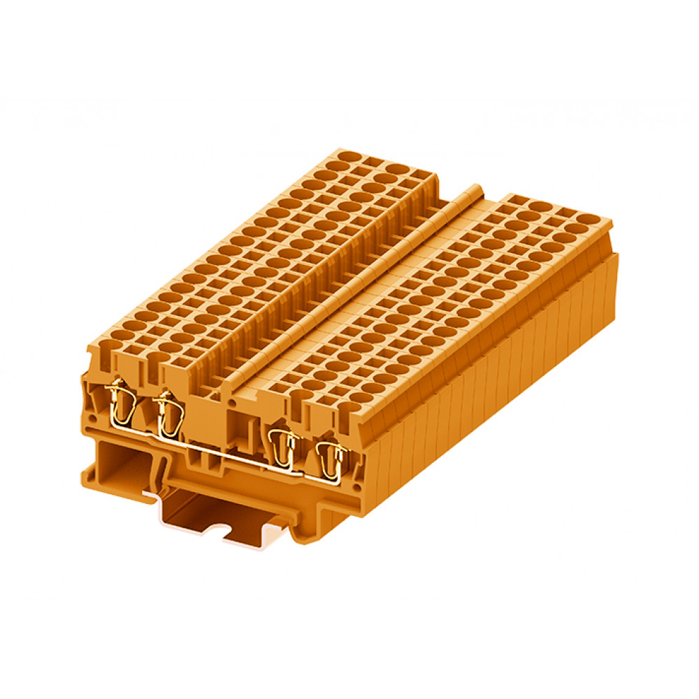 Проходная клемма, 4 точки подключения, тип фиксации провода: пружинный, номинальное сечение: 2,5 мм кв., 24A, 500V, ширина: 5,2 мм, цвет: оранжевый, тип монтажа: DIN35