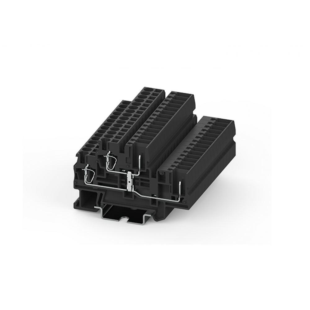 Этажная клемма, 2 этажа, для подключения разъема, межэтажное соединение, тип фиксации провода: пружинный, номинальное сечение: 1,5 мм кв., 16A, 500V, ширина: 3,5 мм, цвет: черный, тип монтажа: DIN35