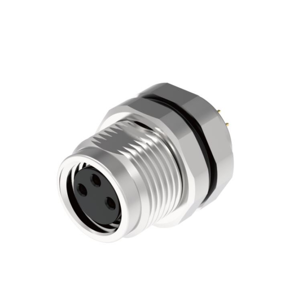 Доставка Розеточный разъем в панель M8B05C-FPSRHUC , Розеточный разъем в панель, 5 полюсов, M8, гайка спереди, вывод под пайку, B-Code, 3А, 30V, резьба на гайке M10*0.75, резьбовое соединение: латунь, неэкранированный