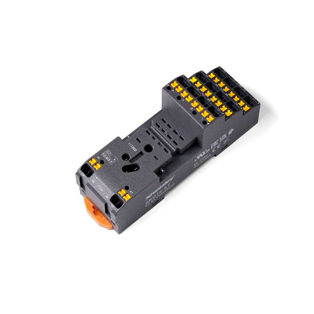 Колодка для реле SKC14-S, Колодка для реле, 4 группы переключающих контактов, пружинная фиксация провода, монтаж на DIN рейку, 300V, 10A, для реле серий: RKE, с возможностью установки (поставляется отдельно): пластик. фикс. SK36F, марк. шильд. SK4P, модуль AMD