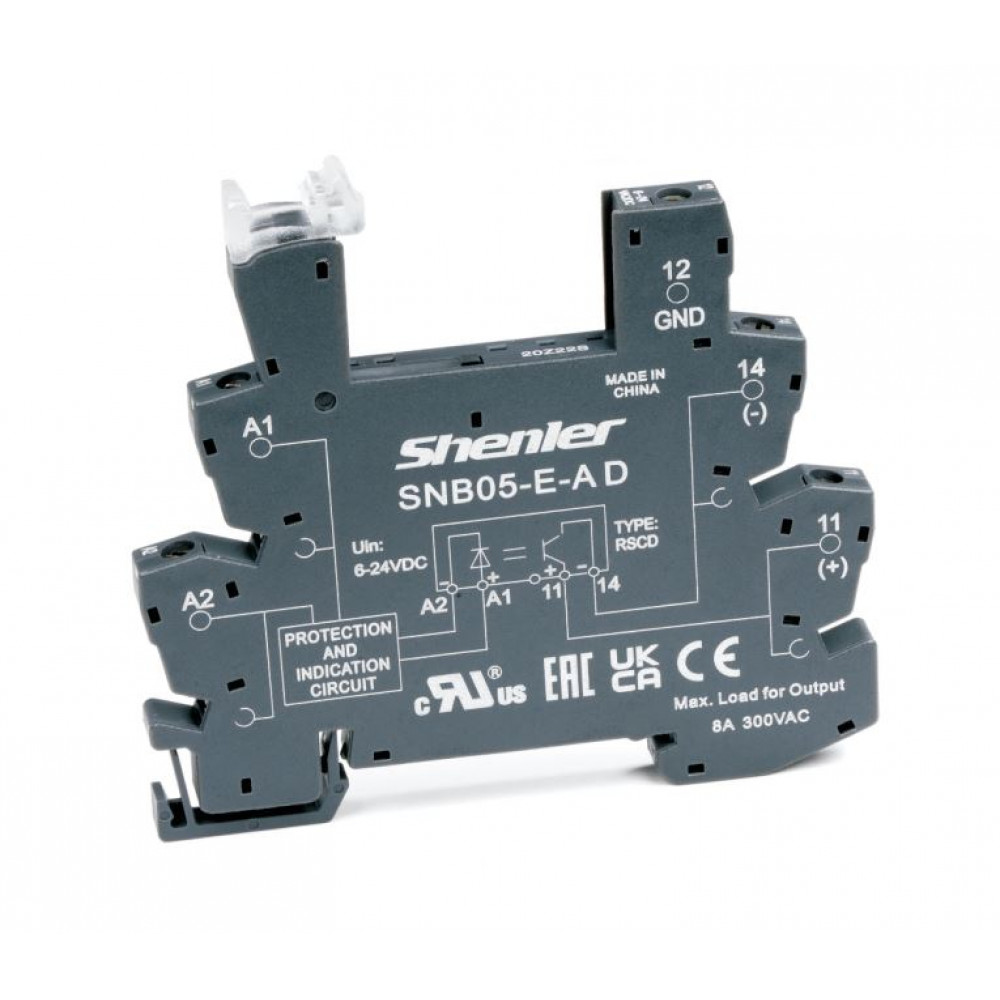 Колодка для реле SNB05-E-A, Колодка для реле, 1 группа переключающих контактов, винтовая фиксация провода, монтаж на DIN рейку, вход 6-24VAC/DC, напряжение катушки 6~24VDC для реле серий: RNC, с возможностью установки (поставляется отдельно): перемычки SN20A, марк. шильд. SN64P