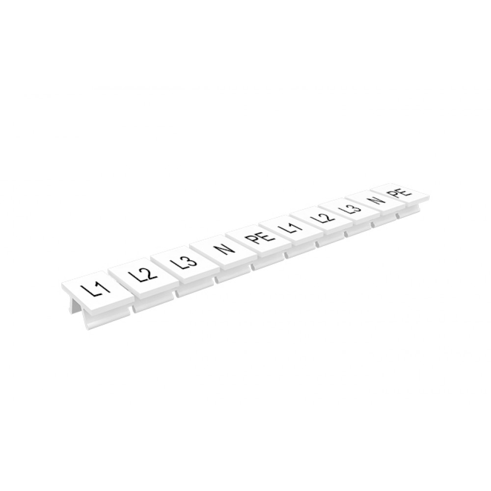 Маркировочные шильдики, для клемм сечением 10 мм.кв., боковая, 10 шильдиков, нанесенные символы: L1.L2.L3.N.PE, с горизонтальным расположением, размер шильдика: 10 x 10,6 мм, цвет: белый