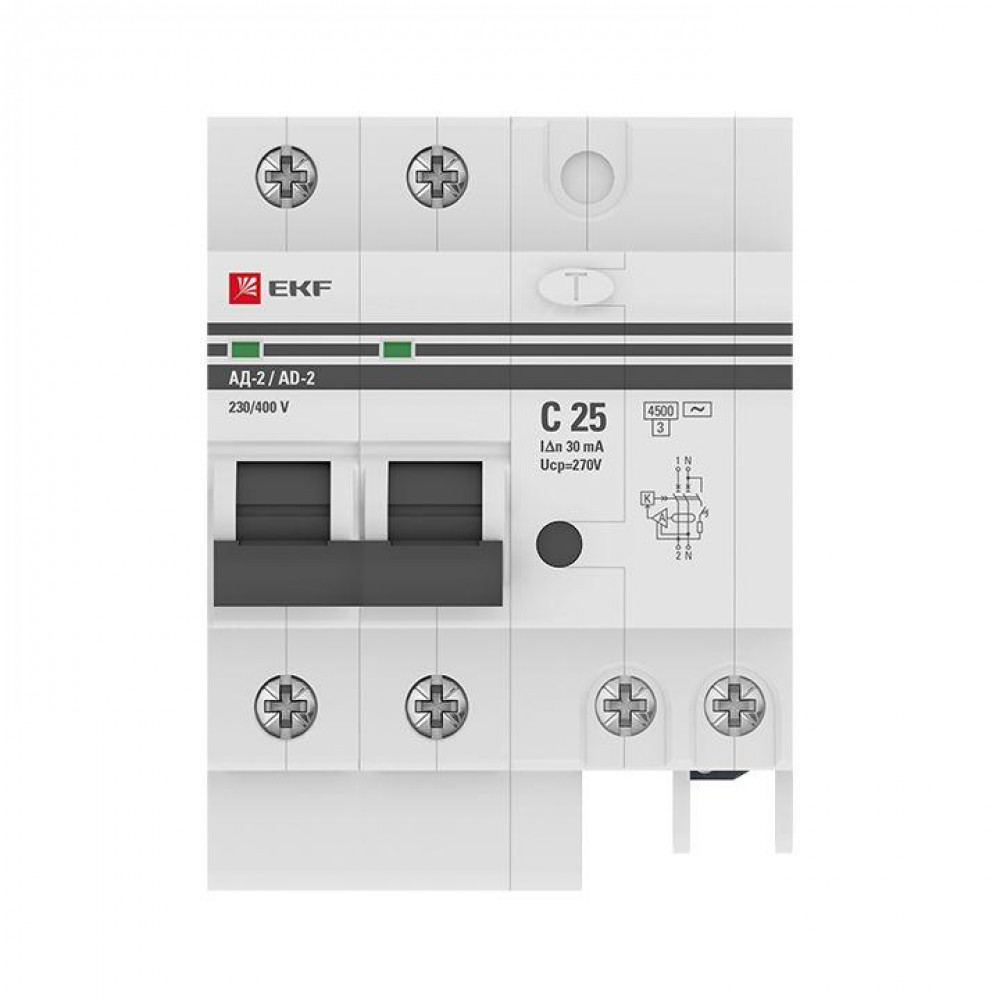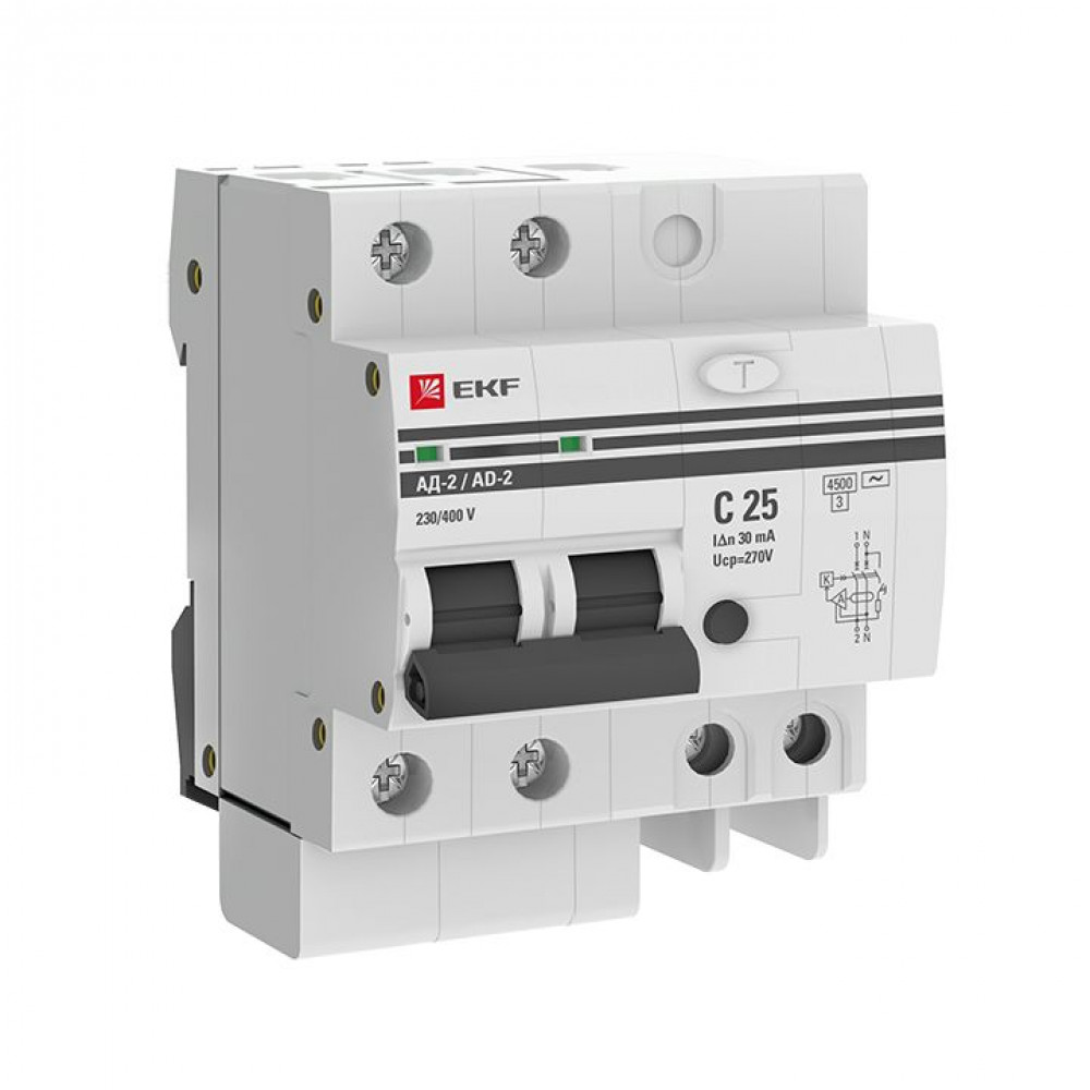 Описание Дифференциальный автомат АД-2 25А/ 30мА (хар. C, AC, электронный) 4,5кА EKF PROxima