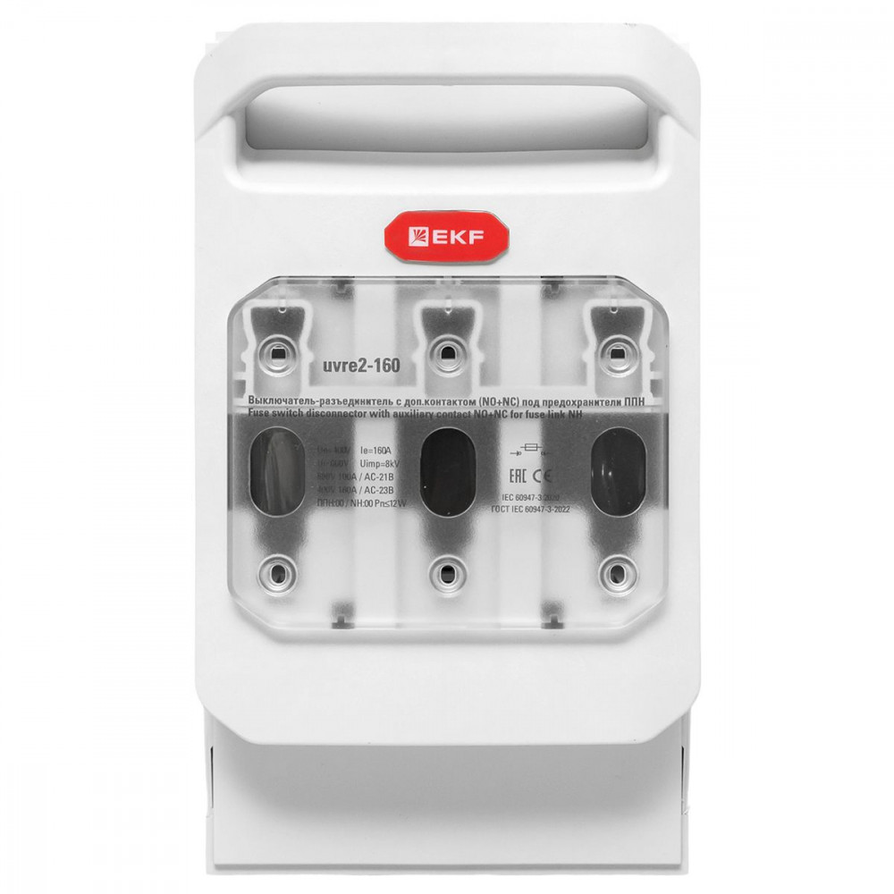 Выключатели-разъединители УВРЭ v2 с дополнительным контактом (NO+NC) откидного типа под предохранители ППН EKF (далее - УВРЭ v2) предназначены для ручного включения-отключения и для защиты от коротких замыканий и перегрузки цепей переменного тока номинальным напряжением до 690В частотой 50Гц (предохранители в комплект поставки не включены). Применяются в вводно-распределительных устройствах, распределительных и шкафах управления и др. Видимый разрыв обеспечивается благодаря откидной крышке, оснащенной держателями предохранителей. При открывании крышки происходит разрыв цепи (первый разрыв происходит в верхней части). Она также выполняет функцию фронтальной защиты от прикосновений.