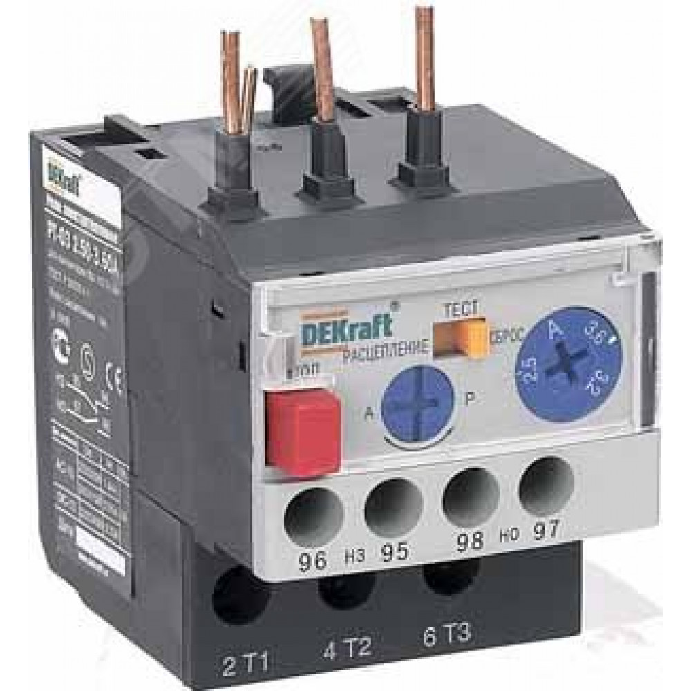 Тепловое реле перегрузки серии РТ-03 DEKraft, предназначено для применения с контакторами КМ-103 на ток 9-18 А, трехполюсное, диапазон уставок реле 0,25-0,36 А, класс расцепления - 10А, два режима повторного включения - ручной и автоматический. Тепловые реле РТ-03 применяются для защиты цепей переменного тока и электродвигателей от перегрузки, асимметрии фаз, затянутого пуска и заклинивания ротора. Реле подходит к соответствующим контакторам других производителей.