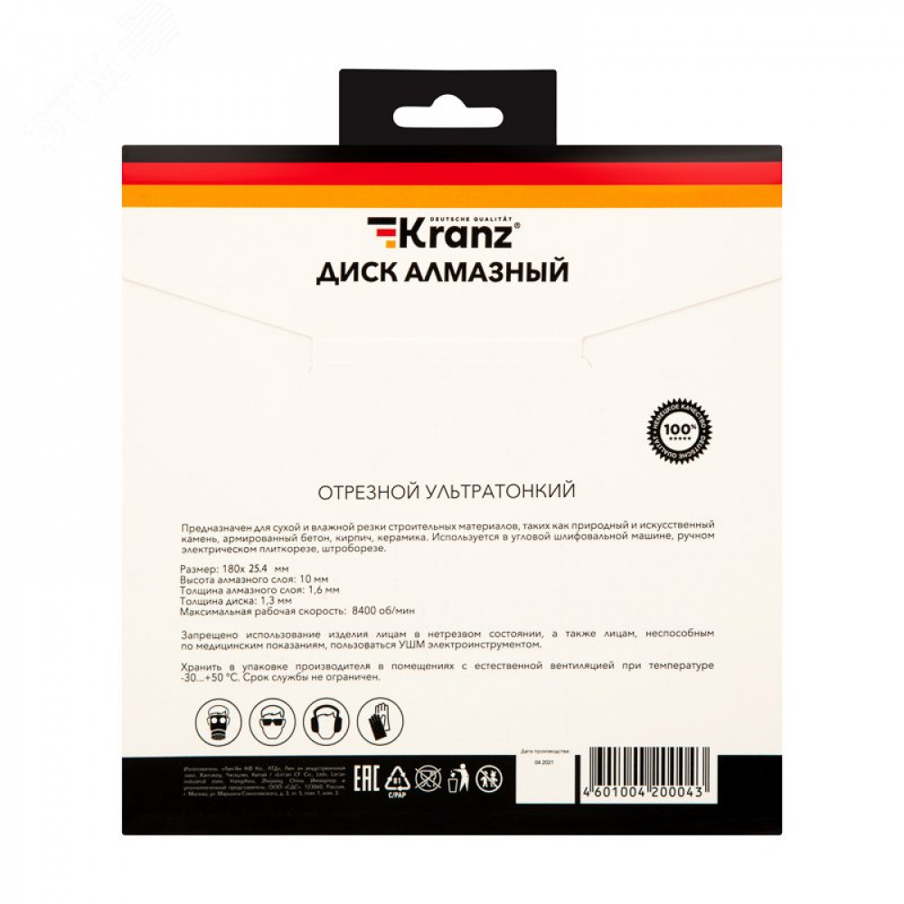 Диск алмазный отрезной ультратонкий 180x25.4/22.2x1.8x10 мм KR-90-0143, Сверло, метчик, плашка