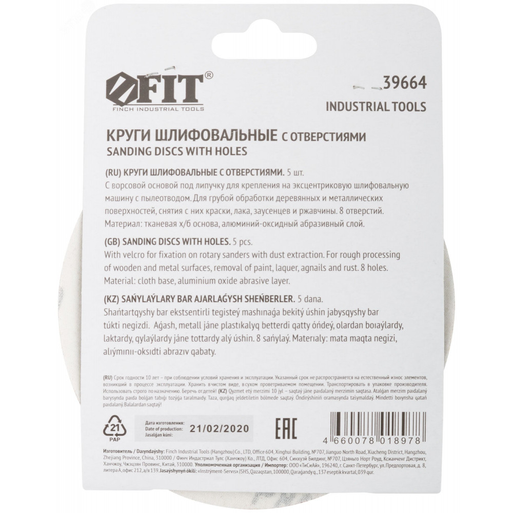 Описание Круги шлифовальные с отверстиями (липучка), алюминий-оксидные, 125 мм, 5 шт Р 80 39664