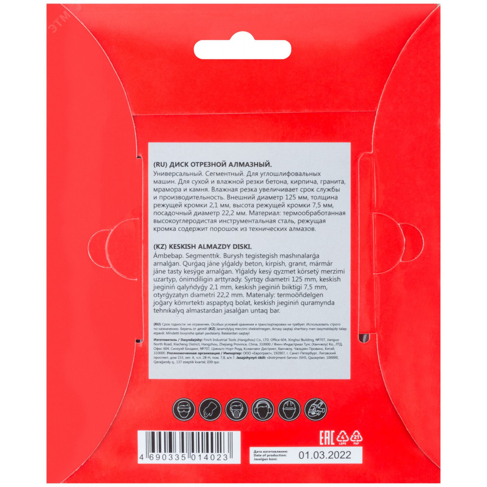 Доставка Диск отрезной алмазный сегментный (сухая и влажная резка) 125х2.0х7.0х22.2 мм 37262