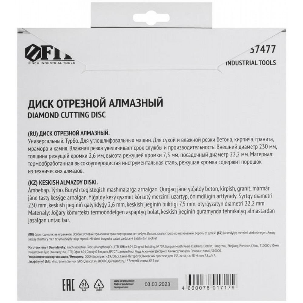 Доставка Диск отрезной алмазный ""турбо"" (сухая и влажная резка) 230х2.8х7.5х22.2 мм 37477
