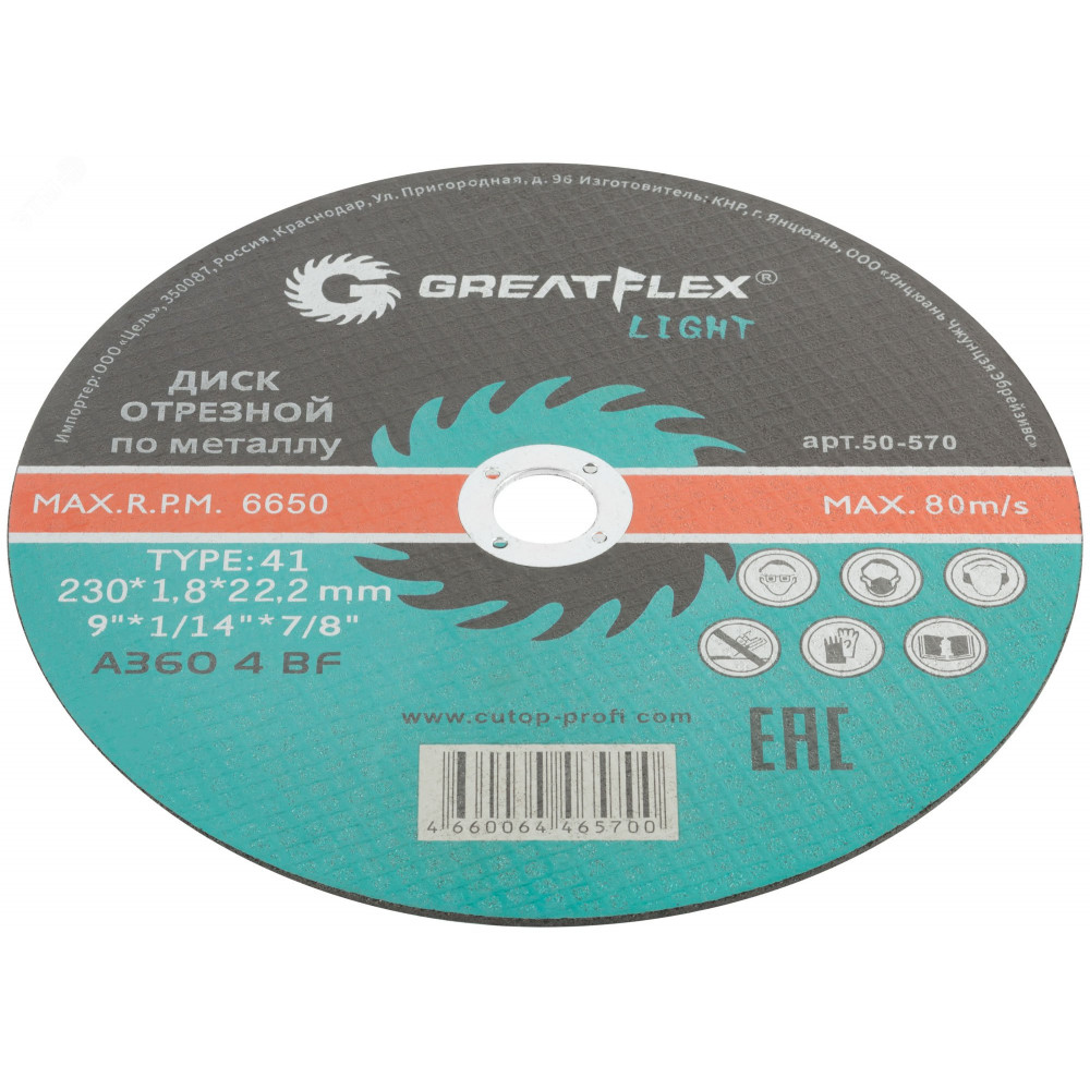 Описание Диск отрезной по металлу T41-230 х 1.8 х 22.2 мм, LIGHT 50-570