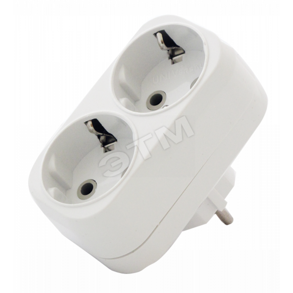Плоский разветвитель 2 гнезда, заземление, белый 16А 250В UNIVersal А302 - простое и удобное устройство для разветвления одной стационарной розетки и возможности подключения одновременно двух бытовых электроприборов. Заземление обеспечивает повышенный уровень электробезопасности.