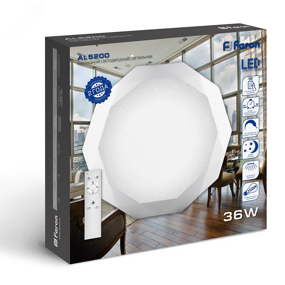 Описание Светильник светодиодный ДБО-36w матовый с эффектом Звездного неба регулировкой цветовой температуры 3000-6500К светового потока max 2900Лм и режима освещенности с пультом управления и таймером выключения 29635